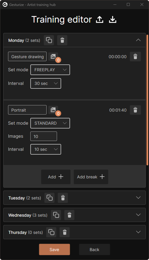 In the custom training, each set has a name, an amount of images, and a timer for each image, all configurable beforehand. You can also assign different libraries to different sets, allowing complete freedom in how you train. Custom training can also be exported and imported for creating backups or sharing with friends!