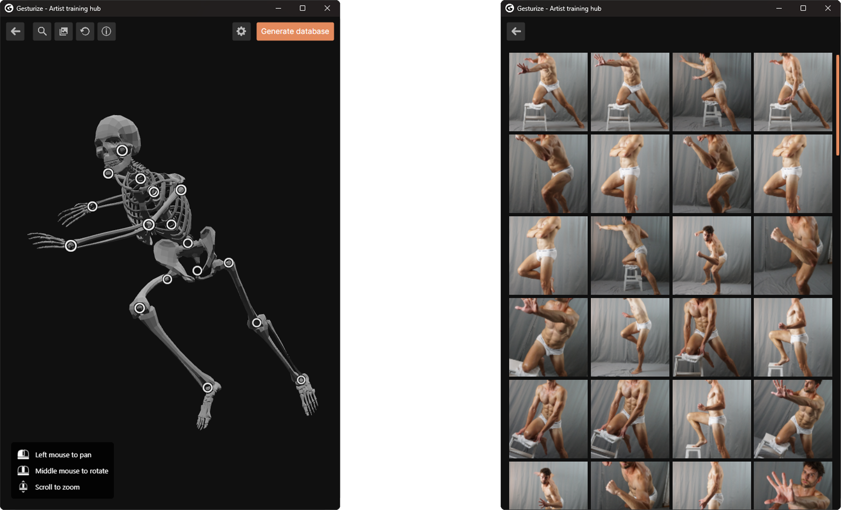The pose finder lets you pose a skeleton inside the app, and later use it to find similar poses among your references. Very handy if you are making a concept or illustration and need a specific reference, without having to manually look among potentially thousands of images!Open Gesturize, pose the skeleton and hit search. You will be presented with a list of references visually similar to the skeleton you posed!