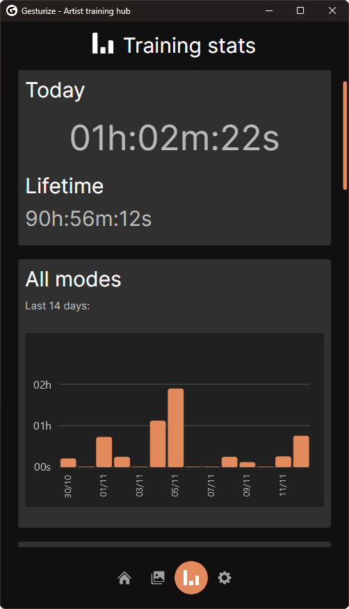 Gesturize offers statistics for each type of training. This lets you track the time spent training in each mode when the timer is enabled. Using the graphs, you can track: